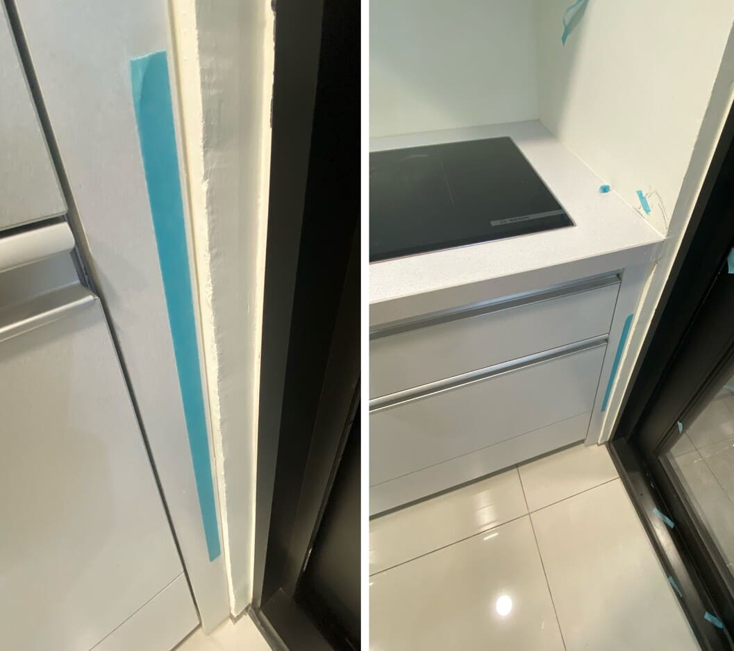 流理台下方櫥櫃右側牆壁接縫處未收邊